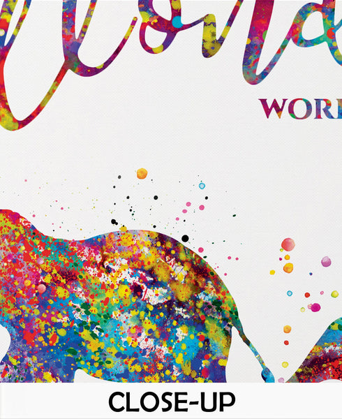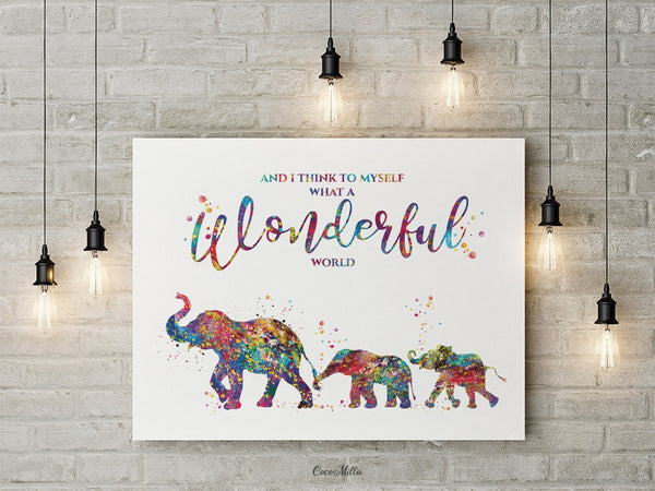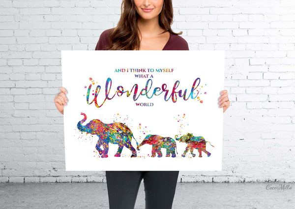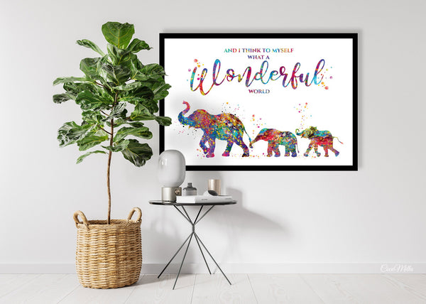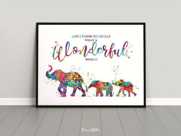 Elephants Family Watercolor Print Mom and Two Baby What a Wonderful World Quote Wedding Gift Wall Art Anniversary Wall Art Baby Shower-1856